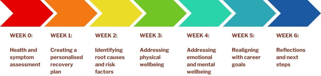 - Creating a Personalised Recovery Plan: burnout recovery isn’t a quick fix, and usually requires a long-term approach. It can take anywhere from 12 weeks to 1 year or more to recover from burnout. Together, we’ll develop a personalised recovery plan that includes practical steps to get you back on track, addressing the various phases of recovery. I’m here to support you and keep you accountable every step of the way.